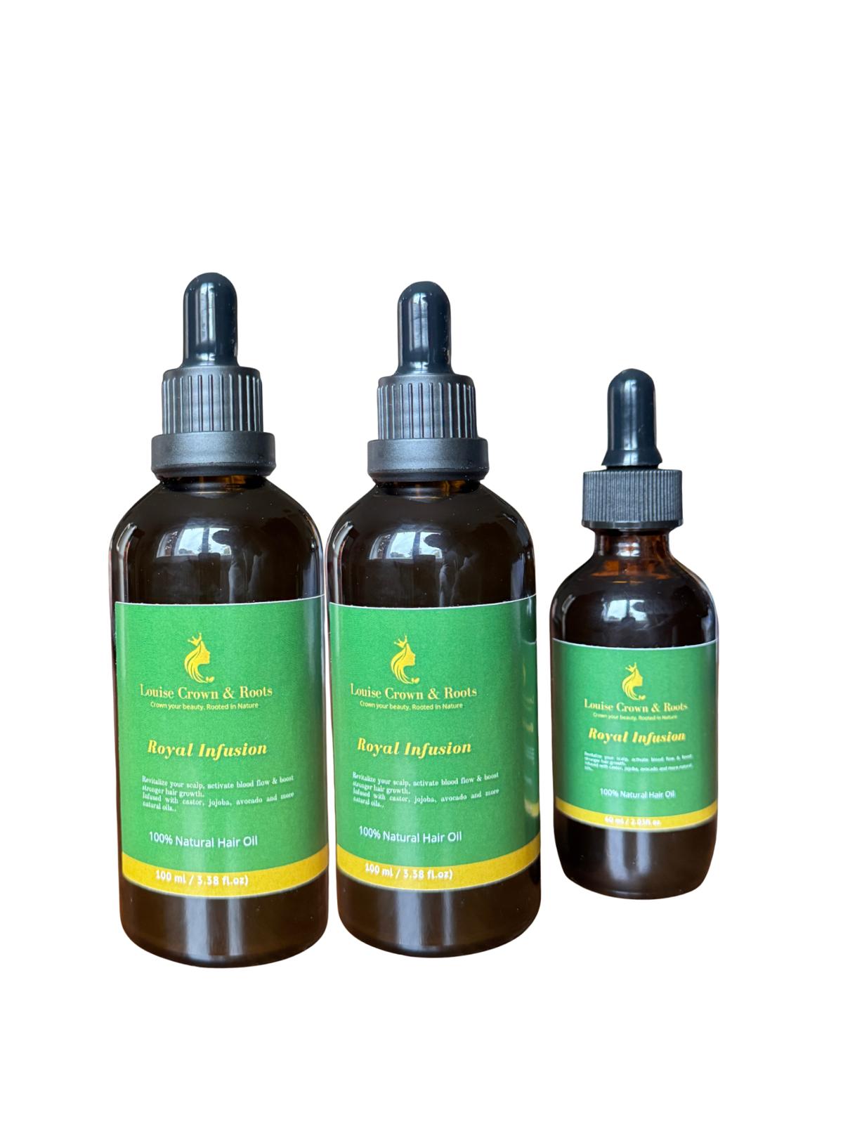 Our Royal Infusion Hair Oil nourishes, strengthens, and promotes the natural growth of hair. Enriched with precious vegetable oils and plant extracts, it stimulates the scalp, reduces breakage, and restores shine and vitality to your hair.